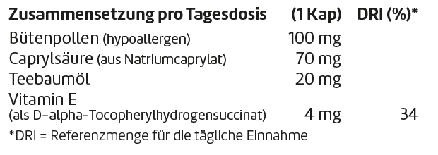 -Eine alternierende Anwendung von Sana Intest Melaleuca wird empfohlen und erhöht die Wirksamkeit; z.B. 2 Wochen Sana Intest P-Complex anwenden und danach 2 Wochen Sana Intest Melaleuca.Überschreiten Sie nicht die empfohlene Tagesdosis, sofern nicht anders angegeben.