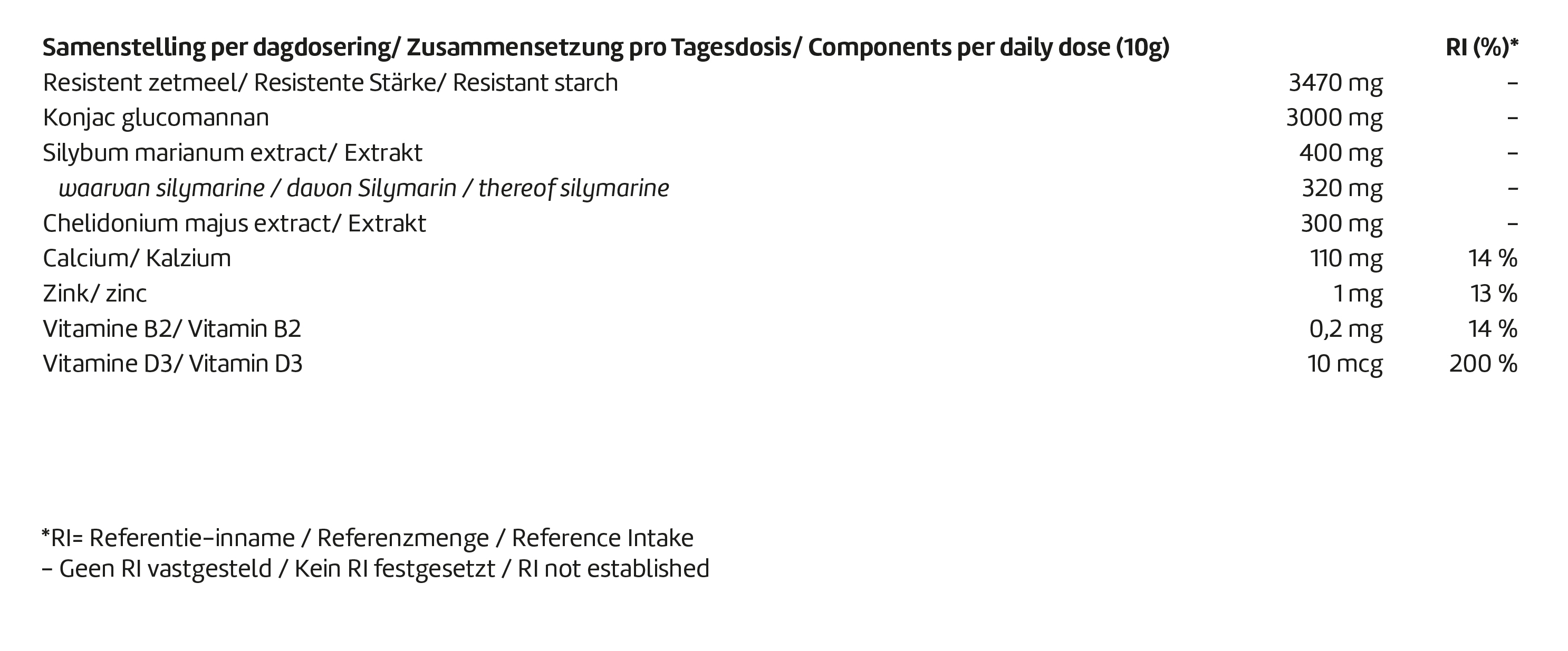 Inhaltstoffe: Resistentes Dextrin, Konjak Glucomannan, Sonnenblumenlecithin, Mariendistel (Silybum marianum) (Extrakt 25:1), Schöllkraut (Chelidonium majus) (Extrakt 10:1), Calciumcarbonat, Zinkcitrat, Cholecalciferol, Riboflavin.