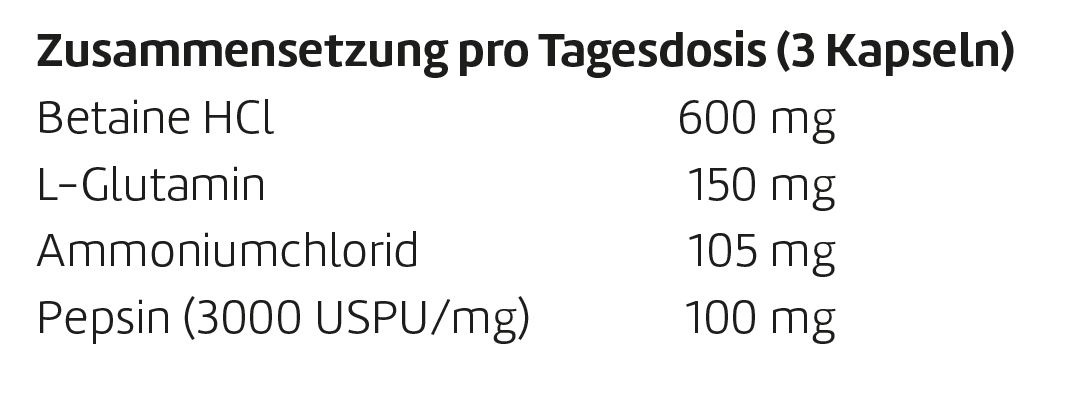 Inhaltstoffe: Betainhydrochlorid, HPMC (Kapsel), L-Glutamin, Reiskonzentrat (Trennmittel), Ammoniumchlorid, Pepsin (Schwein),