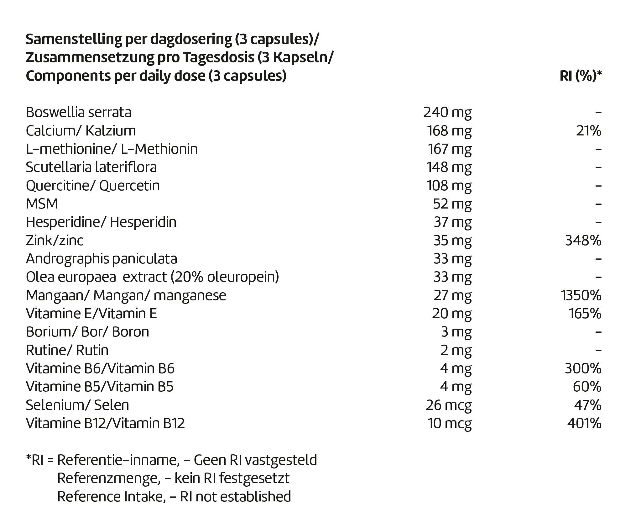 Inhaltstoffe: Calciumcitrat, HPMC (Kapsel), Zinkgluconat, Weihrauch (Boswellia serrata) (Extrakt 65 % 4:1), Mangangluconat, L-Methionin, Helmkraut (Scutellaria lateriflora), Quercetin, Borsäure, Natriumsalz, Magnesiumstearat (Trennmittel), Siliciumdioxid (Trennmittel), Methylsulfonylmethan, natürliche gemischte Tocopherole (Soja), Hesperidin, Indischer Enzian (Andrographis panicu-