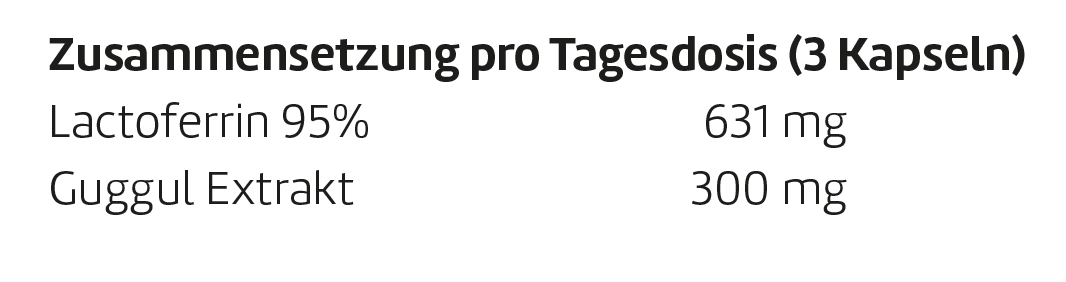 Inhaltstoffe: Lactoferrin 95% (Milch), Guggul (Commiphora mukul) (Extrakt 5% Guggulsteron), HPMC (Kapsel), mikrokristalline Cellulose (Füllstoff), Magnesiumstearat (Trennmittel), Siliciumdioxid (Trennmittel).