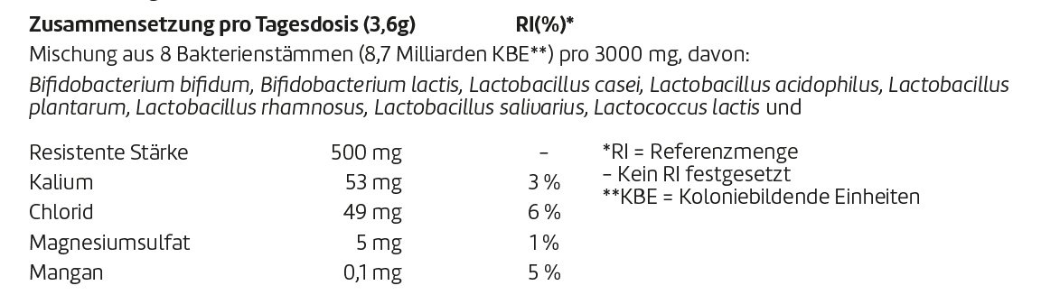 Inhaltstoffe: Bakterienstämme (2,9 Milliarden KBE/g), Bio Kartoffelstärke, Kaliumchlorid, Magnesiumsulfat, Mangancitrat.