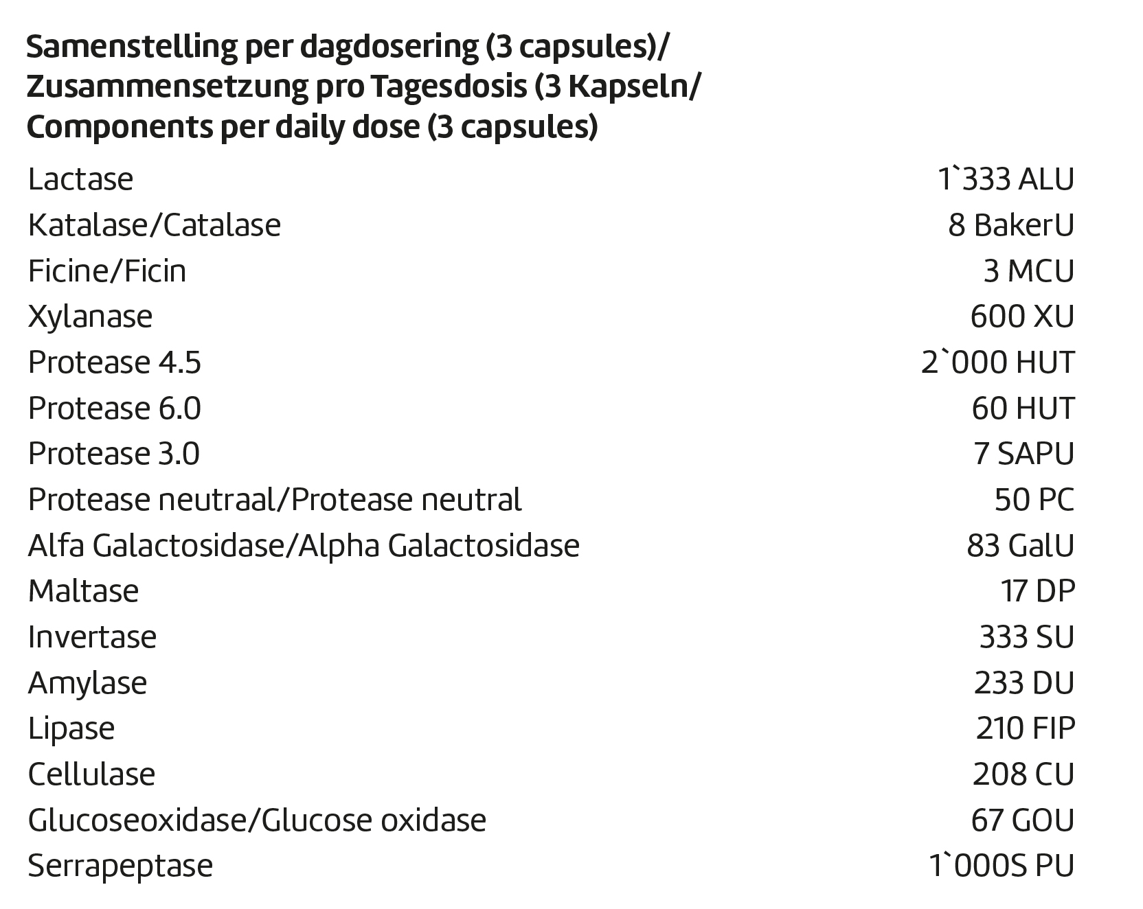Inhaltstoffe: Enzyme, Gummi arabicum (Stabilisator), HPMC (Kapsel), Maltodextrin (Füllstoff), Reismehl (Trennmittel).