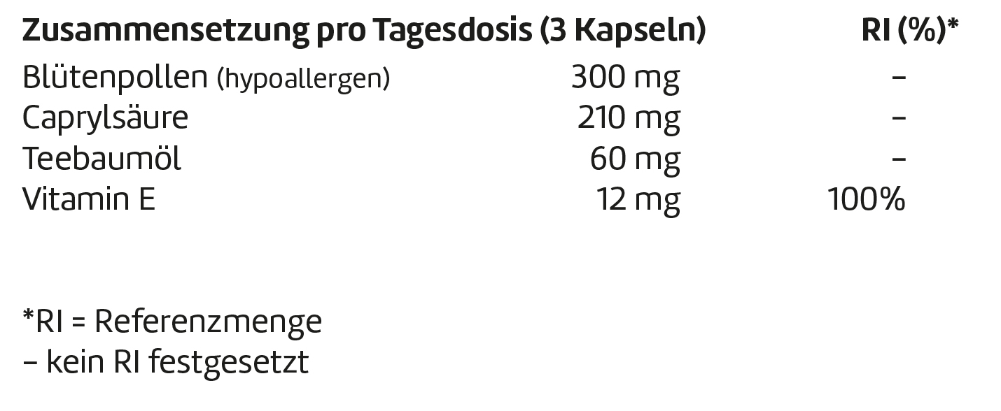 Inhaltstoffe: Reisstärke (Füllstoff), HPMC (Kapsel), Blütenpollen, Natriumcaprylat, Teebaum (Melaleuca alternifolia) öl, Reiskonzentrat (Trennmittel), D-alpha-Tocopherylhydrogensuccinat.