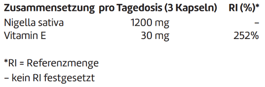 Inhaltstoffe: Schwarzkümmel (Nigella sativa), HPMC (Kapsel), D-alpha-Tocopherylsuccinat.