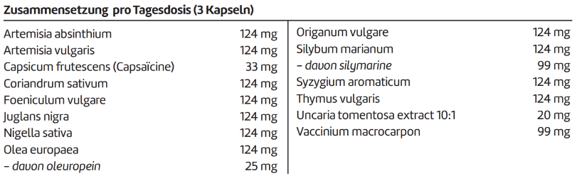 Inhaltstoffe: HPMC (Kapsel), Wermut (Artemisia absinthum) Extrakt, Thymian (Thymus vulgare) (Extrakt 4:1), Schwarzkümmel (Nigella sativa) Extrakt, Fenchel (Foeniculum vulgare) Extrakt, Olivenblatt (Olea europaea) (Extrakt 20 % Oleuropein), Schwarznuss (Juglans nigra) (Extrakt 4:1), Gewürznelke (Syzygium aromaticum), Koriander(Coriandrum sativum) Extrakt, Mariendistel (Silybum marianum) (Extrakt 80 % Silymarin), Oregano (Origanum vulgare) Extrakt, Cranberry (Vaccinium macrocarpon) (Extrakt 36:1), Reiskonzentrat (Trennmittel), Cayennepfeffer (Capsicum annuum) (Extrakt 6:1), Katzenkralle (Uncaria tomentosa) (Extrakt 10:1).